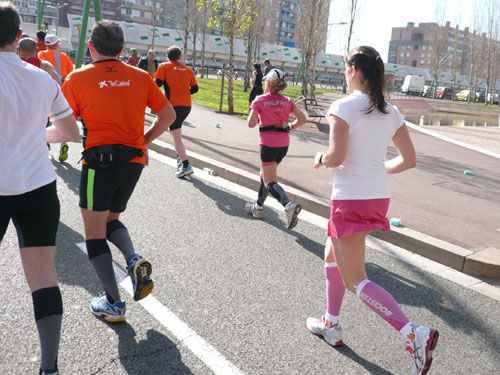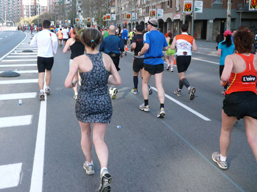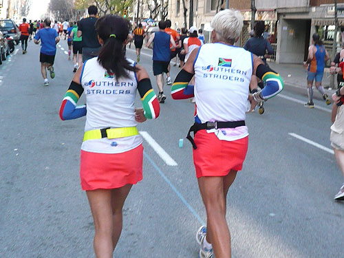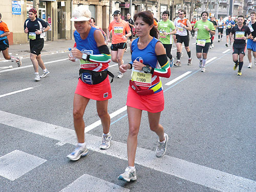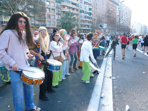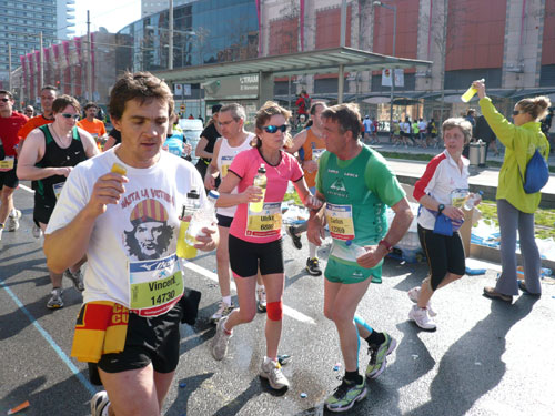 Die nächsten Kilometer lassen geben mir Gelegenheit, die optischen Leckerbissen zu verdauen und mich etwas mehr auf’s Laufen zu konzentrieren. Dafür sorgen aber einige Bands und Entertainment-Stationen für Abwechslung. Laut Veranstalter sollen es deren 40 sein. Dazu kommt noch eine etwa einen Kilometer lange Begegnungsstrecke, die ab KM 19 beginnt. Margot kann ich hier, kurz vor meiner Halbzeit, auf der gegenüberliegenden Spur ausmachen. Mein lieber Scholli, sie ist wieder gut drauf. Da sie zwei Startblöcke hinter mir gestartet ist, muss sie zeitlich bereits auf meiner Höhe sein.