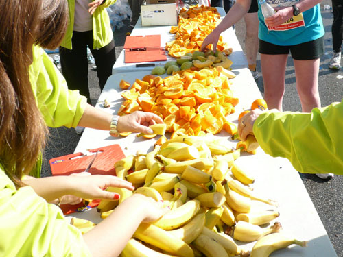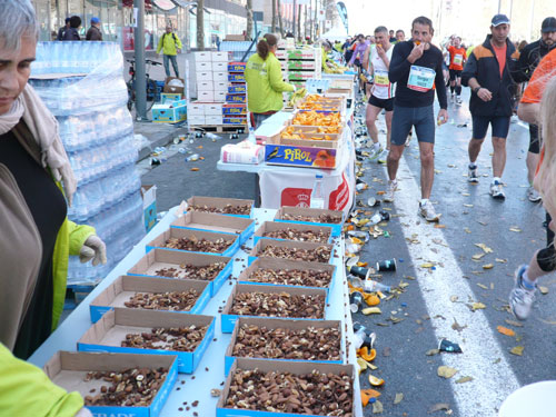 Auf gleichem Weg wie wir gekommen sind, geht es zurück bis zum Beginn der „Diagonale“, diesmal nur auf der anderen Straßenseite, getrennt von einem teilweise mehrere Meter breiten Mittelstreifen. Unten angekommen können wir wieder verpflegen, zum frischen Obst gibt es jetzt auch Trockenfrüchte und Nüsse. Körperlich fühle ich mich nicht mehr gerade frisch, daher gönne ich mir mein einziges mitgeführtes Energiegel.