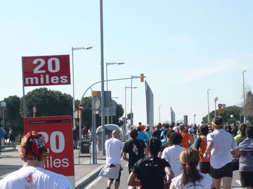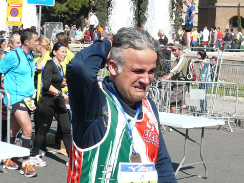 Auf dem Zulauf des Monuments und danach säumen wieder unglaublich viele Zuschauer den Weg. Venga, Venga habe ich heute schon oft gehört, aber hier ist es besonders eindringlich, als wir nach dem Bogen durch ein dichtes Spalier von Menschen laufen. Ich bekomme heute nicht genug, bin richtig beflügelt von Lauf, Land und Wetter. Ich kann mich nicht erinnern, mich nach fast 40 km jemals noch so gut gefühlt zu haben.