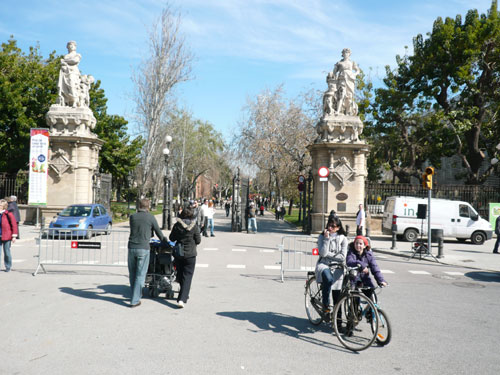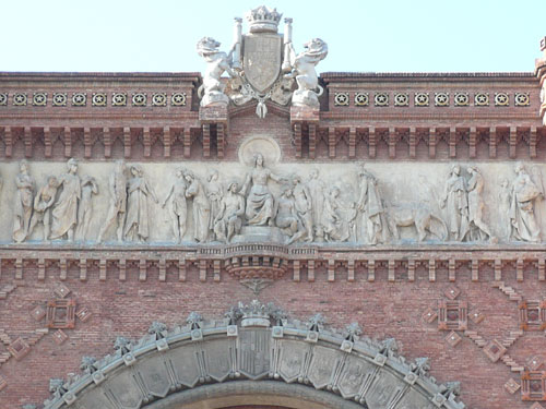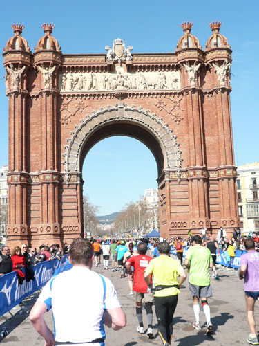 Karin hat mich bereits vor einigen Kilometern bei einer meiner Fotosessions überholt. Jetzt kann ich mich zurückrunden, ich bin nur mehr auf der Überholspur. Am Zoo verlassen wir nach 4 km Strandlauf wieder das Meer. Am wunderschönen, in rötlicher Ziegelbauweise errichteten „Arc de Triompf“ gönne ich mir aber doch noch eine konzentrierte Fotopause, der muss vernünftig auf den Chip. Anlässlich der Weltausstellung 1888 wurde er als Haupteingangstor im neu-maurischen Stil errichtet.