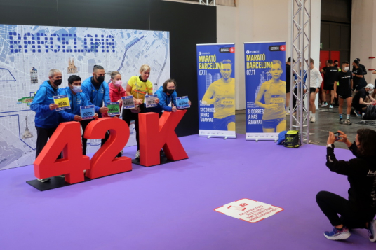 Das Areal rund um besagte Plaça Espanya markiert das Herz der Veranstaltung. Der riesige kreisrunde Platz westlich des Stadtzentrums zu Füßen des 173 m hohen Montjuïc und sein Umfeld bieten optimale Rahmenbedingungen. Da ist zunächst einmal das weitläufige Messegelände, in dessen Halle acht man an den beiden Tagen vor dem Lauf die Startunterlagen bekommt. Wohl beraten ist, wer sich vorher die per Internet übermittelten Unterlagen etwas genauer anschaut. Ich habe es nicht und so dauert es ein wenig, bis ich den etwas unauffälligen Zugang finde, der dann allerdings in eine riesige Halle führt, wo man nach dem "bib-number-pick-up" in Ikea-Manier im Zickzack durch die modern und großzügig gestalteten Gänge der Marathonmesse gelotst wird. Noch nie habe ich so viele Erinnerungs-Foto-Spots gesehen, vor denen sich die Teilnehmer in langen Reihen geduldig wartend mit Startnummer in der Hand freudig strahlend ablichten lassen.