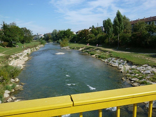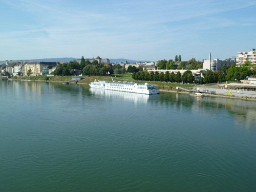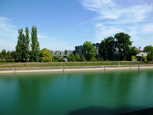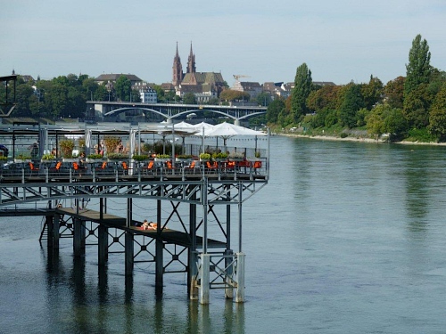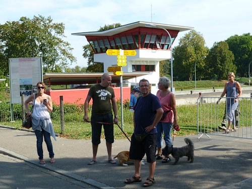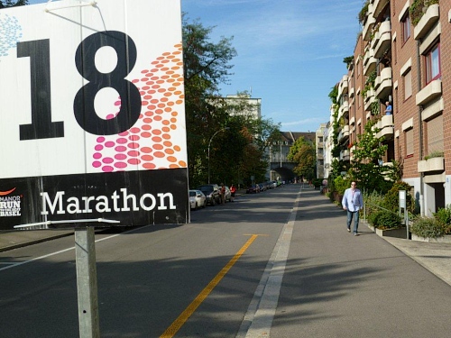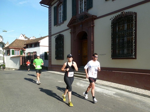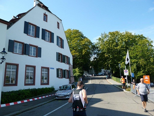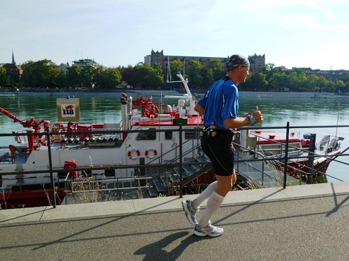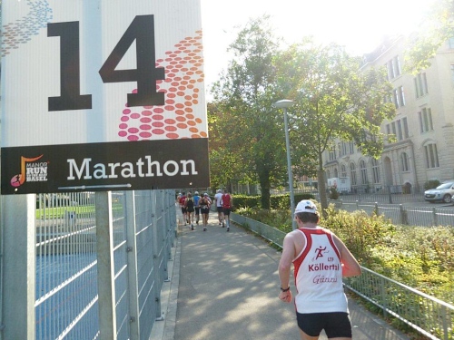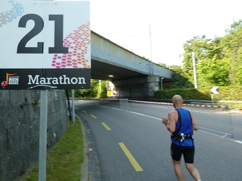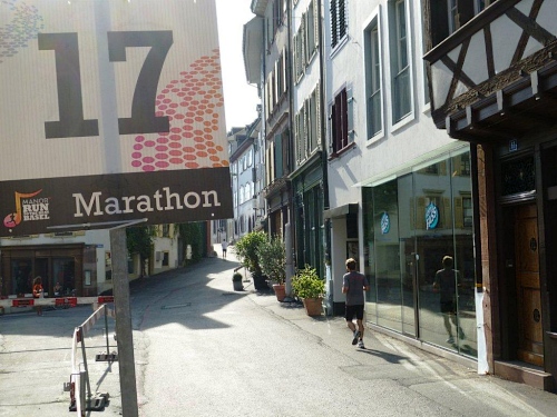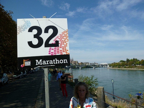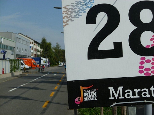 Zuerst geht es aber am Rheinhafen vorbei, Basels Tor zum Meer und damit zur Welt, und anschließend im Schatten von Alleebäumen der Wiese entlang. Das Einkaufszentrum linkerhand, zu Zeiten eines starken Euros dicht an der Grenze zu Deutschland erbaut, durchlebt schwere Zeiten. Die Schweizer nutzen die Frankenstärke und gehen auf der anderen Seite der Grenze einkaufen, die Deutschen und Franzosen bleiben dem Konsumtempel fern. Sicher ist die Währungssituation auch ein Grund, dass aus den Nachbarländern im Dreiländereck nicht mehr Läufer für einen Start in Basel gewonnen werden konnten. Für die Schweizer ist das Startgeld in einem für diese Art Veranstaltung gewohnten Rahmen gehalten.