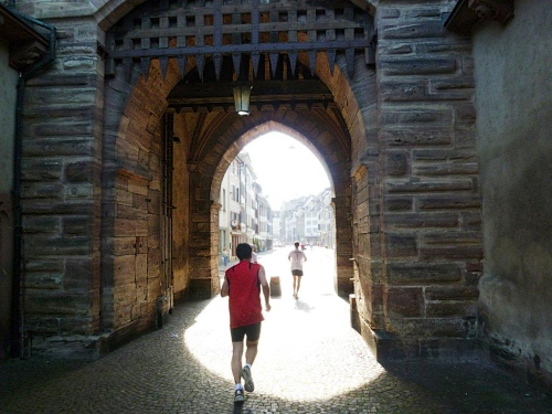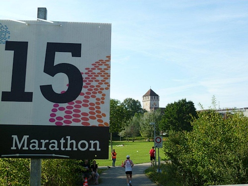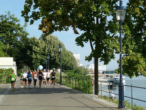 Das St. Johanns-Tor durchschreiten wir nicht, sondern begeben uns gleich wieder zum Rheinufer. Flussaufwärts laufen wir wieder unter der Johanniterbrücke hindurch zum Stadtzentrum. Günni ist davongezogen, genauer gesagt: ich komme ihm nicht mehr nach, denn die bei den Fotostopps „verlorene“ Zeit kann ich nicht mit Zwischensprints aufholen. Dazu fehlt mir die Fitness, so viel ist mir klar. Nach meiner nachhaltigen Erkältung ist es nicht verwunderlich, dass ich nicht die Energie dazu aufbringe. Auch der Pulk um die Zugläufer für 4:00 wird mich bald überholen. Was soll’s? Ich muss niemandem etwas beweisen und ich bin glücklich, dass ich überhaupt wieder laufen kann, dazu im Sonnenschein und ohne drohende Cut Off-Zeiten.