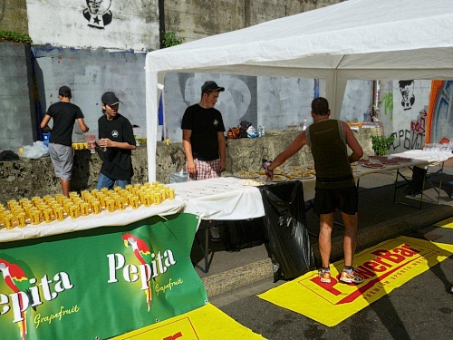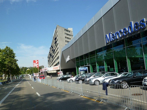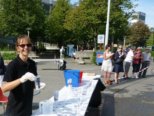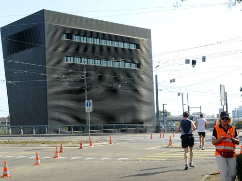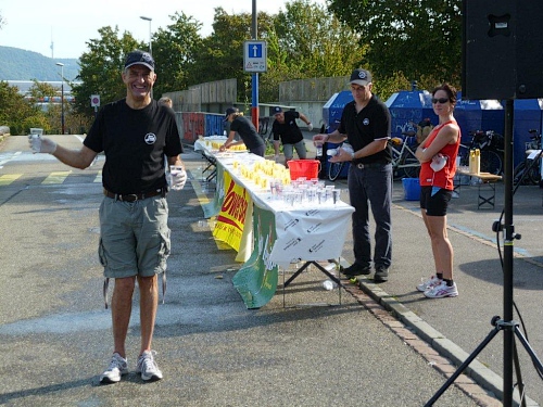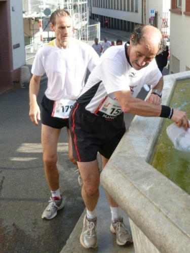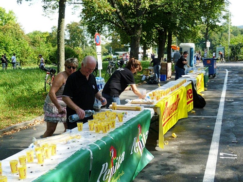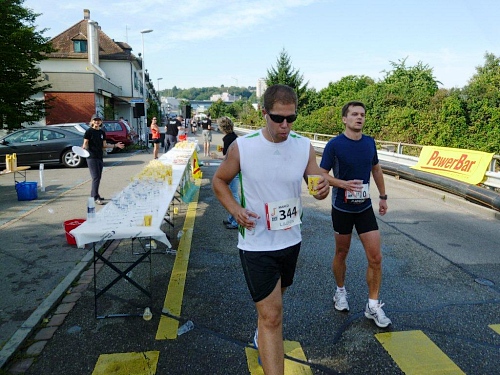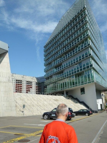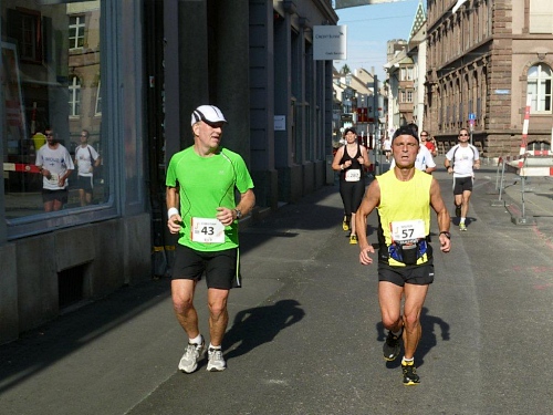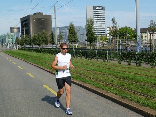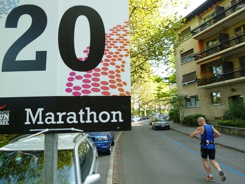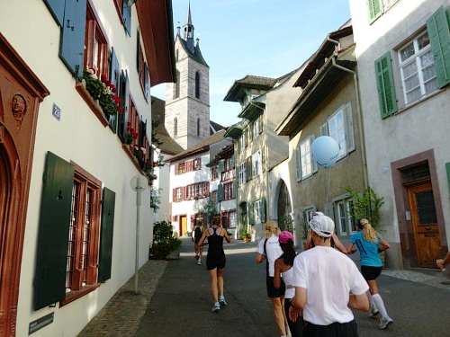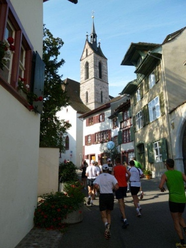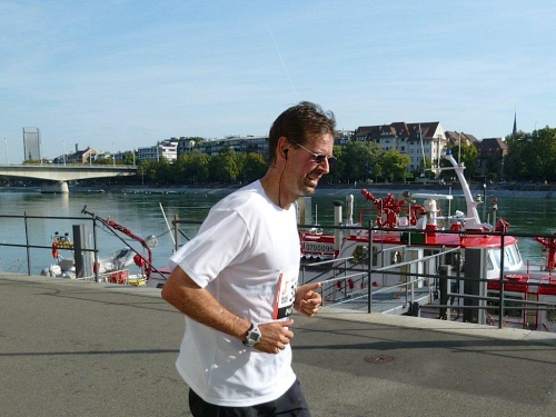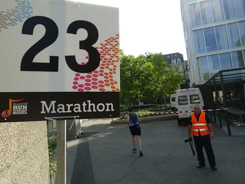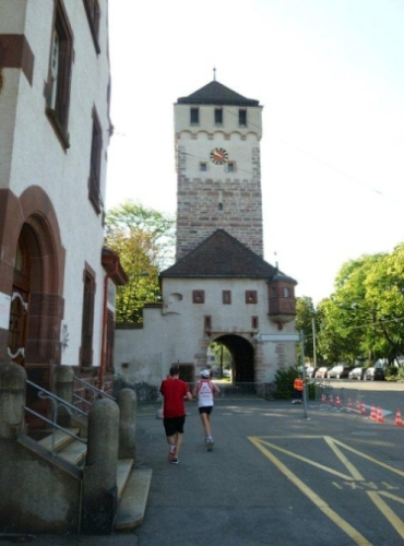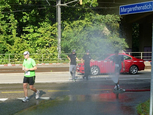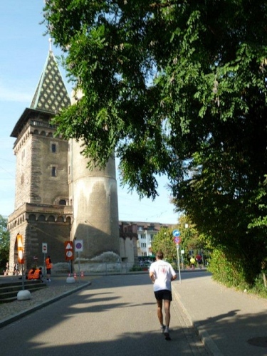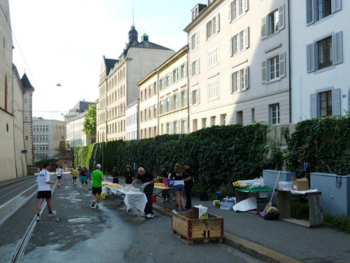 Die Lange Erlen, das Naherholungsgebiet mit Tierpark, bietet einen Kilometer schattiges Laufen und kurz nach dem Verlassen dieser grünen Oase gibt es schon wieder einen Verpflegungsstand. Nach dem Unterqueren der Gleisanlagen des Badischen Bahnhofs ist es nicht mehr weit zur Messe Basel, welche kräftig am Bauen ist. Nein, der Messeturm wird nicht aufgestockt, obwohl die Züricher ihn als höchstes Gebäude der Schweiz entthront haben. Bei aller Rivalität der Städte, das wäre dann doch zu plump. Die Basler können sich gewiefter wehren: Die nächste Fasnacht wird es wieder unter Beweis stellen. Für die Durstabwehr der Läuferschar steht auf dem Messeplatz eine Wasserstation bereit.