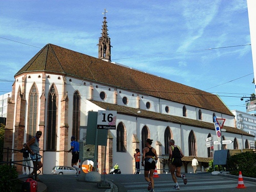Die lange Gerade der Clarastraße führt in der Verlängerung noch nicht über die Mittlere Brücke. Das sparen wir uns für den letzten ganzen Kilometer auf. Wir nehmen die Kurve, der nächste Fixpunkt ist das Klingental. Ehemals Kloster, dann Kaserne, jetzt Kunst, so könnte man den Werdegang dieses Gebäudeensembles bezeichnen. Die gotische Baukunst der ehemaligen Kirche gefällt mir, also muss ich sie erst bildlich festhalten und dafür noch einmal Gas geben, damit ich mich weiter mit Günni unterhalten kann, mit dem ich schon seit zehn Kilometern laufe.