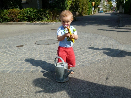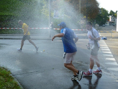 Seit ich nur noch selten Gesprächspartner habe, sind immer wieder die Stöpsel in den Ohren, mit welchen ich mir Turboladung verschaffe. Bei der Halbmarathonmarke kommt zum Aufheizen die gleiche Musik aus den Boxen, aus einem Hydrant kommt ein Wasserschwall zur Abkühlung und eine Batterie von gefüllten Bechern steht zur inneren Temperaturregulierung bereit.