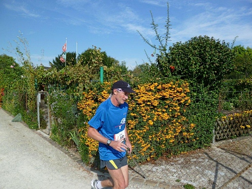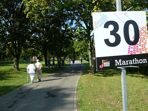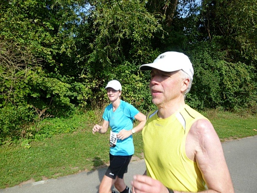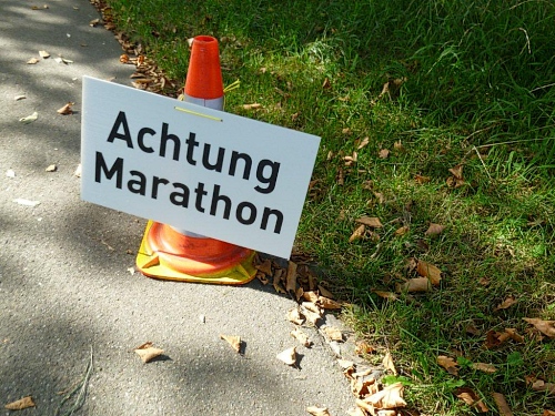 Statt zu erblühen welke ich und muss mich nicht mehr umdrehen, um die Gruppe um den Zugläufer zu sehen, dafür bald die Brille anziehen, damit ich sie vor mir überhaupt noch wahrnehmen kann. Entsprechend wenig Gesellschaft habe ich jetzt vor und hinter mir, geschweige denn neben mir. Dabei würden die Wege und Straßen einem Mehrfachen an Startenden ausreichend Platz gewähren.