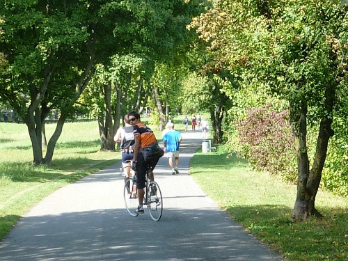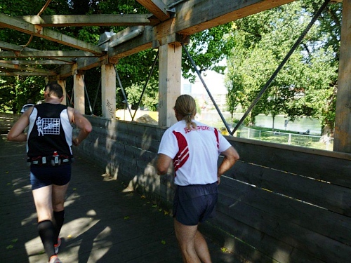 Ums Kasernenareal herum geht es wieder zur Rheinpromenade und wir treten dort das Pflaster schon zum zweiten Mal mit unseren Füßen. Diesen Pfad verlassen wir aber schon bald wieder und nehmen den leichten Anstieg unter die Füße, der uns auf die Dreirosenbrücke bringt, wo wir schon wieder verpflegt werden. Auf der anderen Seite wird die erste Abbiegemöglichkeit genutzt, damit wir direkt in den St. Johanns-Park einbiegen können.