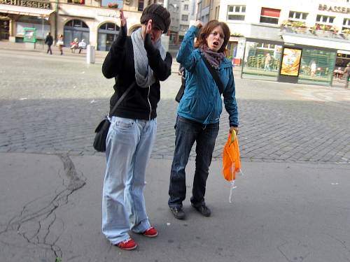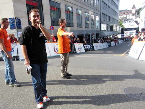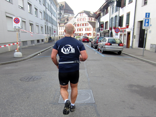 Nach der Labestelle geht es leicht abwärts vorbei an der westlichen Seite des Baseler Zoos durch die Steinenvorstadt hinein in die City in Richtung Barfüsserplatz. Mehrere Dutzende Menschen stehen hinter der Absperrung, viele klatschen. Ich fotografiere, mein oranges M4Y-shirt verleiht mir eine quasi-offizielle Funktion. In Wien etwa macht man sich lustig über jene Zeitgenossen, die, sobald sie von irgendwem eine „Uniform“ bekommen, schlagartig ein neues Selbstwertgefühl von sich haben. Das soll nicht abwertend gemeint sein, doch schon der Schweizer Dichter Gottfried Keller schrieb die Novelle: „Kleider machen Leute.“ Wenige Meter nach dem Barfüsserplatz beginnt bei km 12 eine kleine Steigung auf den Kohlenberg hinauf, die ich mit Elan meistere.