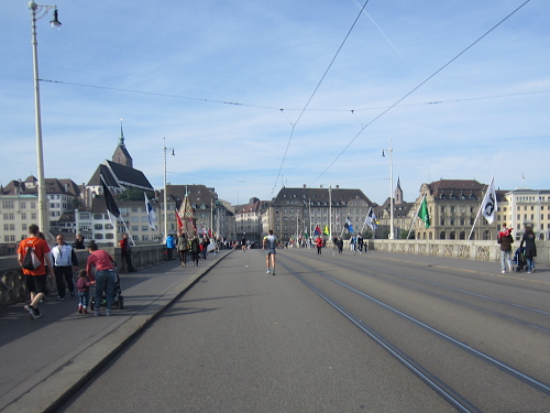 Es geht nun wieder über den Rhein, und zwar auf der Dreirosenbrücke. Die Sonne ist nach eineinhalb Stunden inzwischen herausgekommen, er wird wieder ein schöner Spätsommertag. Ich habe heute zwar zwei Lagen übereinander angezogen, doch wirklich warm ist mir damit noch nicht geworden. Etwa zur Mitte der Brücke befindet sich die 15km-Marke, es geht nun abwärts und ich beschleunige wieder. Die Garmin zeigt 1:38 an, immerhin schon 8 Minuten über meiner stets angestrebten Idealzeit, außer bei Bergmarathons.