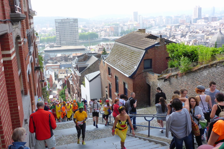 Bei Kilometer fünf trifft mich der Schlag, ich bleibe regungslos stehen, mir fällt die Klappe runter: Vor mir ist die Soldatentreppe (Montagne de Bueren). Über 374 Stufen, 194 Meter geht es vom Viertel Or Chateau den Hügel hinauf, wo einst die Burg von Lüttich stand. Zwar bin ich schon steilere Sachen gelaufen, aber der Anblick mit den vielen lustig-bunten Läufern ist das Bild des Jahrzehnts! 1:35 Stunden beträgt hier am Fuße der Treppe die Cut-Off-Zeit.