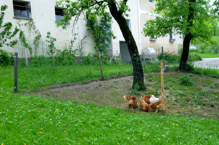 Ein Schild weist den folgenden Abschnitt als Panoramaweg aus, was einige wenige Minuten wirklich zutrifft: Der Blick ins Kremstal und auf den gegenüberliegenden Höhenrücken ist klasse, nachdem uns der Dauerregen der vergangenen beiden Tage rechtzeitig verlassen hat und auch der Dunst verschwunden ist. Bauernhof zur Linken, glückliche Hühner zur Rechten, so verlassen wir den Asphalt und biegen auf einen schönen, leider nur kurzen Waldpfad ein, dem sich ein feiner, allerdings sehr nasser Wiesenweg anschließt. Ich beglückwünsche mich jetzt schon zu meiner Entscheidung für GoreTex-Schuhe. Zum ersten Mal steht hier der Fotograf, der uns den ganzen Lauf begleiten wird, und dessen Produkte wir später kostenfrei von der Homepage der ausrichtenden LG Kirchdorf herunterladen dürfen. Ein feiner Zug von Euch!
