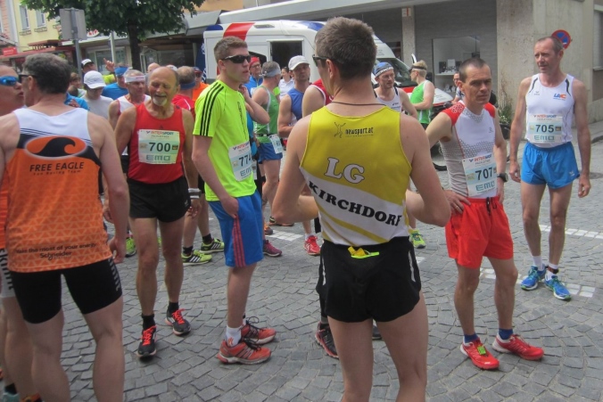 Ich rede kurz mit dem Kollegen aus Linz, der immer einen Schritt voraus sein will. Er hat heuer den Linz-Halbmarathon in 1:57 gefinisht, das ist für einen Sechzigjährigen eine gute Zeit, finde ich. Ob er allerdings heute wirklich zwei Runden laufen würde, wird sich noch zeigen.
