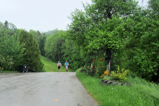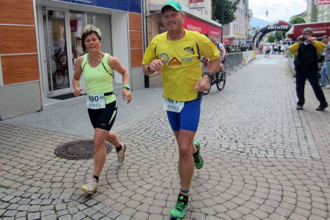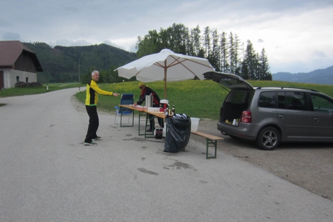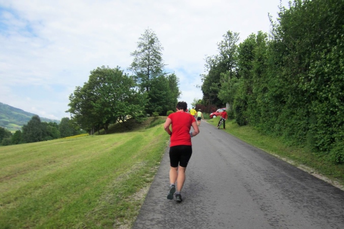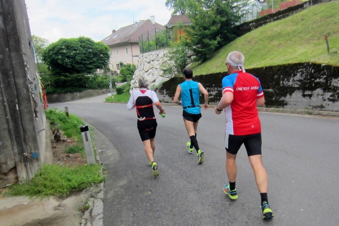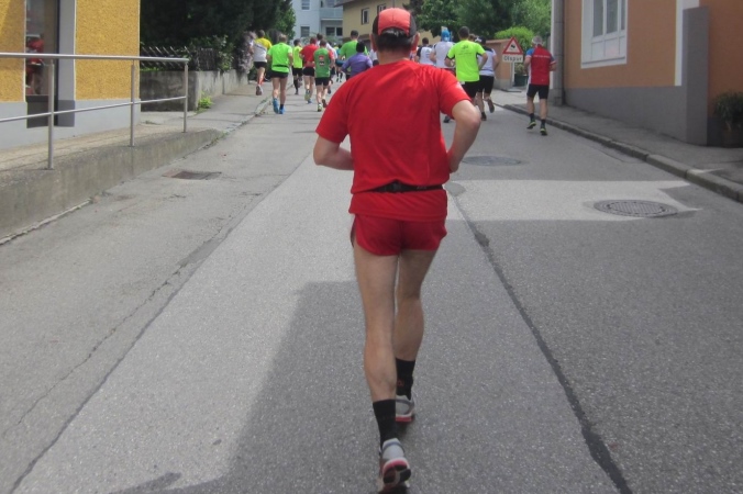 Noch drei Kilometer sind es bis zum ersten Durchlauf im Ziel in Kirchdorf, die angestrebten 2:30 sind zu schaffen. Eine Pinkelpause muss drinnen sein, die Andreas aus Linz nutzt, um davonzuziehen.