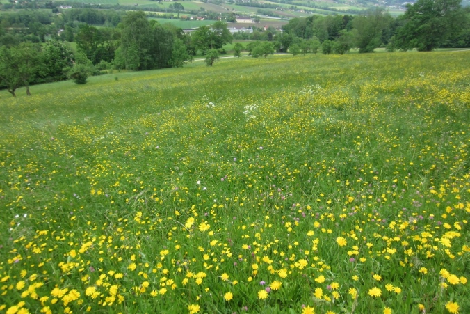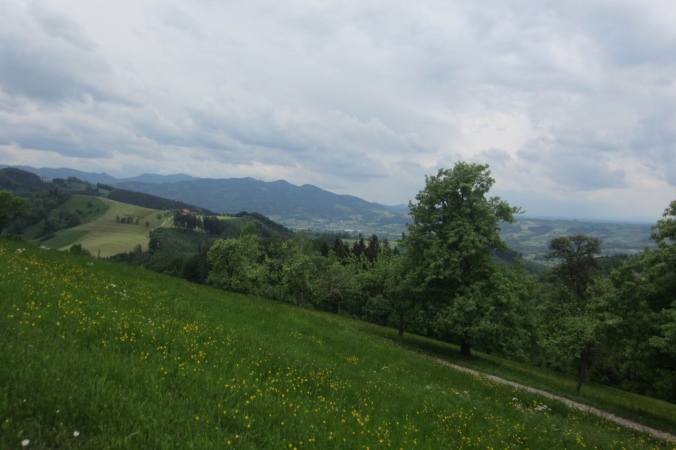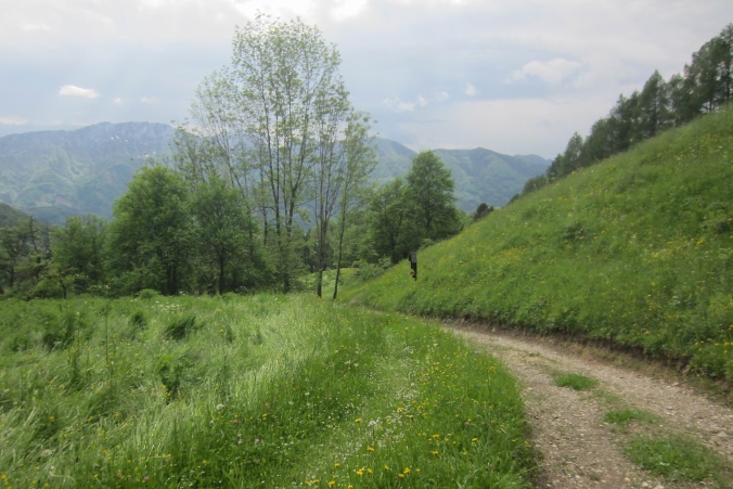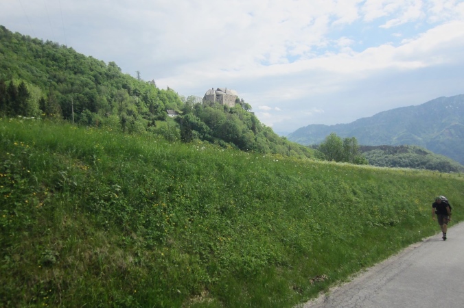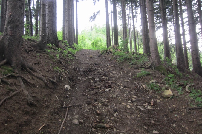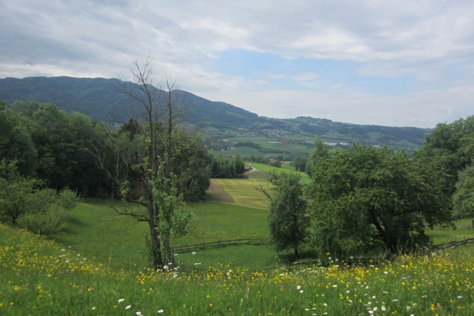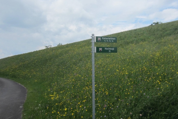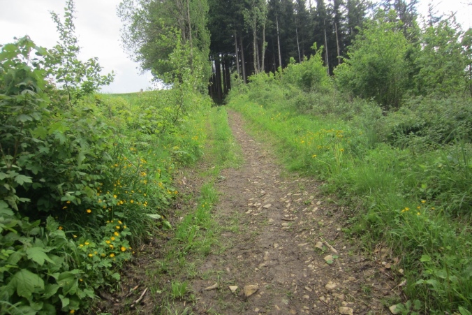Voriges Jahr war es hier so schlammig, dass man nicht vorwärts kam. Ich versuchte an den Rändern des Hohlwegs zu gehen, was aber wegen der vielen Pflanzen auch sehr schwer war. Heuer ist diese Passage viel leichter zu bewältigen. Ich bin trotzdem froh, dass ich nun oben bin.