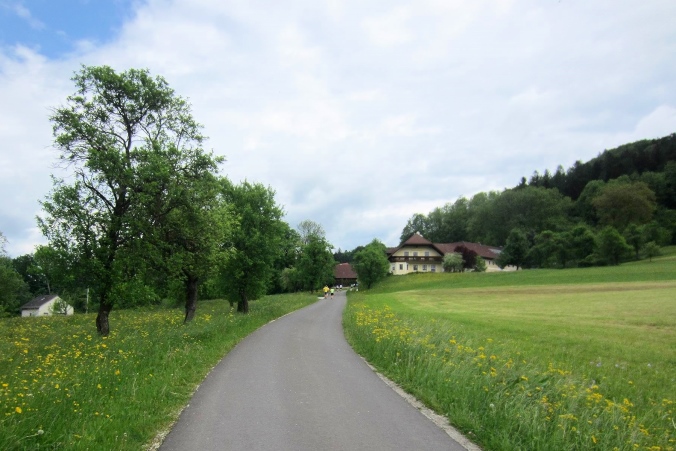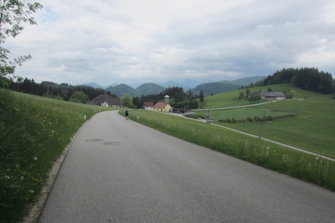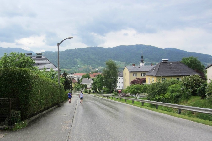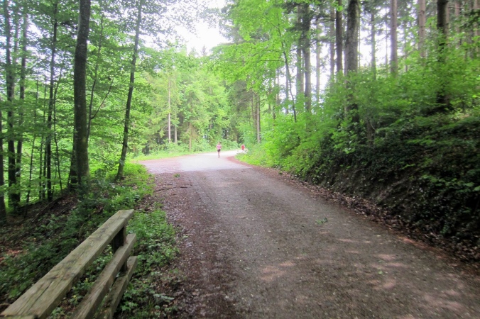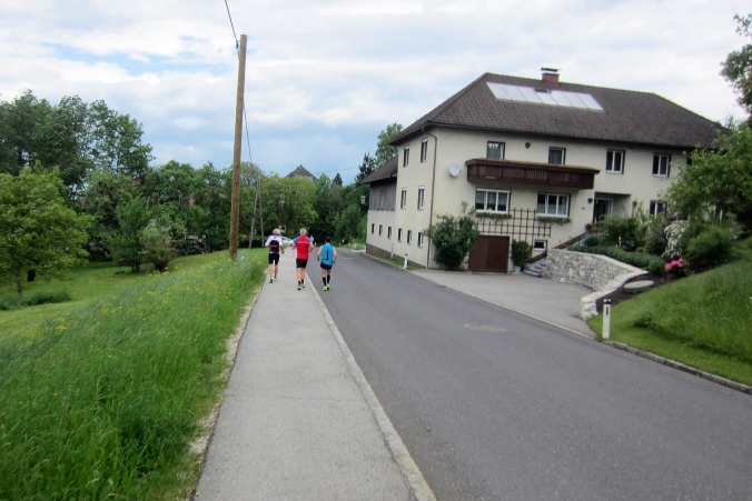 Auf dem nun folgenden Abschnitt bis hinunter nach Kirchdorf kann man sein Tempo erhöhen, bald habe ich den Linzer wieder eingeholt. Und auch zwei Halbmarathonläufer, die vorher bei Km 5 den Käfergraben hinauf davongezogen sind.