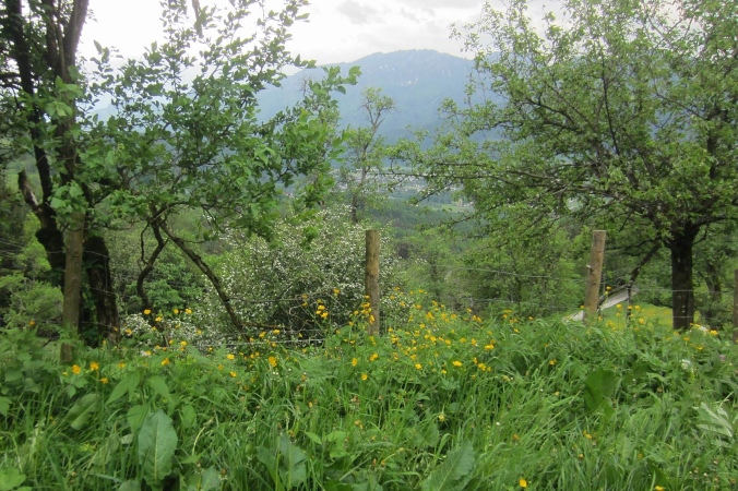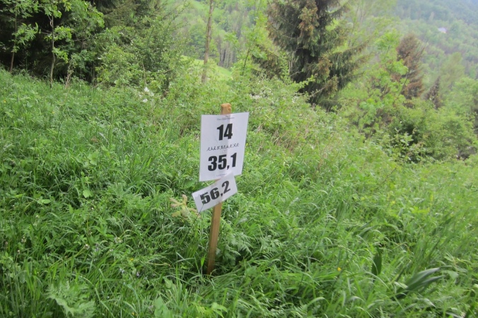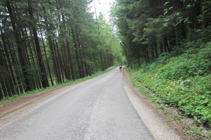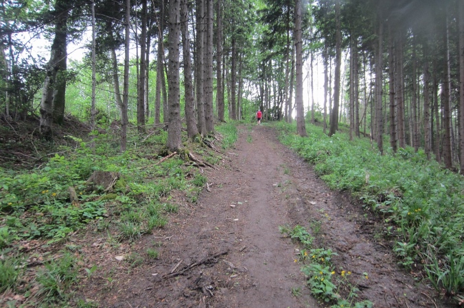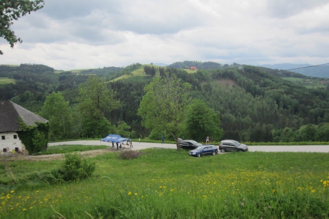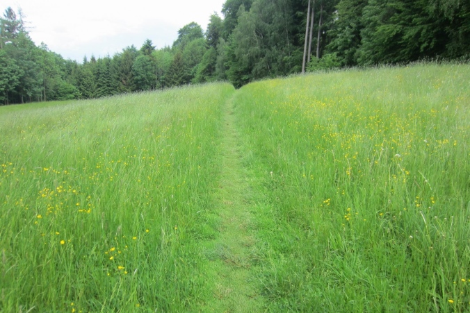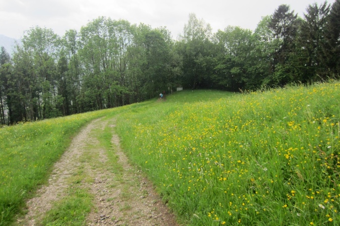 Ich bin schon zum dritten Mal hier, kenne daher die Strecke, die nun von der Straße wegführt auf einen Wiesenabschnitt und kurz durch den Wald. Voriges Jahr war hier Schlamm, heuer ist es weitgehend trocken.
