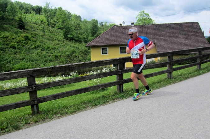 Ich trete die 2. Runde an und halte Ausschau nach dem Linzer. Die Fernsicht vor dem Anstieg bei Hausmaning beträgt 1 km, doch Andreas ist nicht mehr zu sehen. Ich denke mir, dass er die Möglichkeit wahrgenommen hat, sich nur für eine Runde werten zu lassen – später schaue ich nach und stelle fest, dass er mit 2:31:23 Dritter in der Altersklassen M-60 geworden ist.