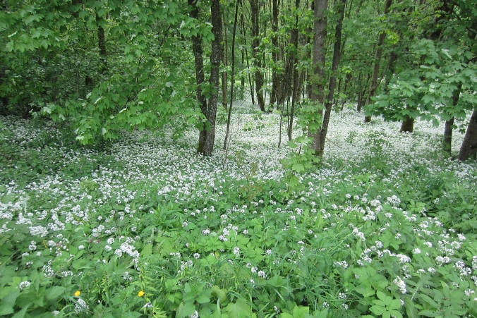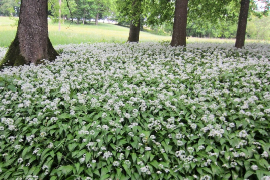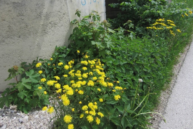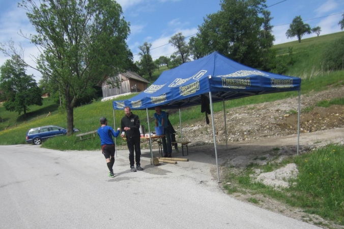 Auch die zweite Labe bietet neben Wasser, Iso, Cola und Bananen sogar Red Bull an. Da das Läuferaufkommen im hintersten Feld nicht mehr groß ist, kann man sich bestens bedienen. Die Strecke nach Oberschlierbach ist ein einziges Naturerlebnis. Die blühenden Blumen - Hahnenfuß, Vergissmeinnicht, Beinwell, Schierling, Dotterblumen, Wasserminze u.a.m. auf den Wiesen, der Duft aus dem feuchten Wald, auf der Straße leider viele zerdrückte Nacktschnecken. Ich beobachte, dass sich Dutzende kleinere Schnecken um die toten Weichtiere versammeln und dem Kannibalismus frönen.