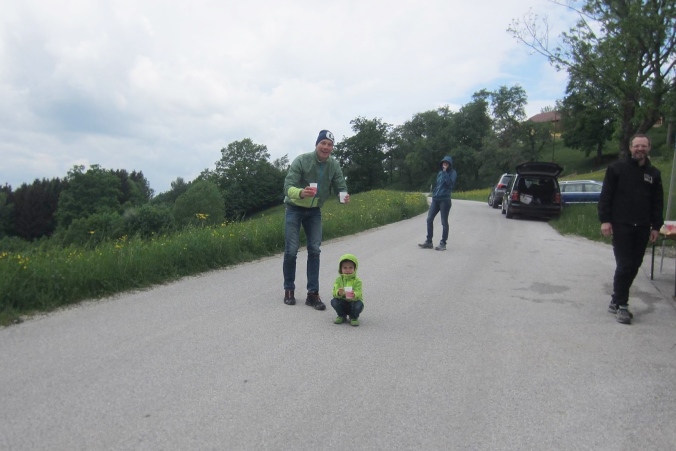Hans Hufnagel verkündet den Start des 6. Über Drüber-Marathons, Punkt 11 Uhr geht es los – vor allem für die Läufer im Vorderfeld. Ich habe mich hinten postiert, so wie es dem eigenen Leistungsniveau entspricht. Laut Ausschreibung ist der Kurs gleichgeblieben: 80% der Strecke verlaufen wie 2014 auf Asphalt, 20% auf Schotter, Wiesen- und Wanderwegen. Es werden keine Straßen, Wege etc. von der Organisation gesperrt, für die Läufer gilt die StVo. Nur so viele Autos fahren hier nicht, dass man im Vergleich zu slowakischen Straßen mit Durchzugsschwerverkehr bei Marathons ständig Angst um sein Leben haben muss.