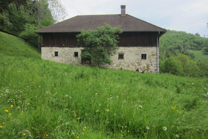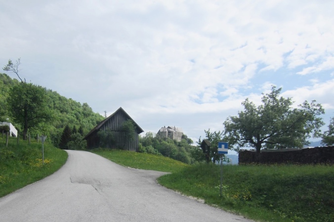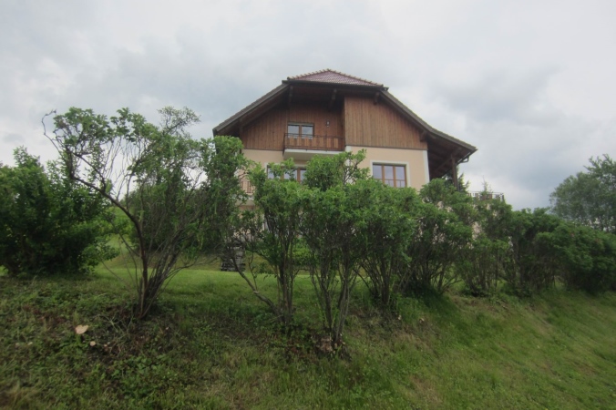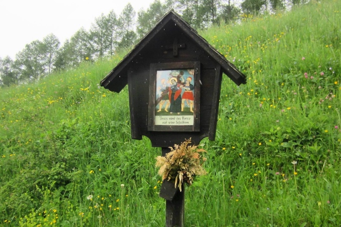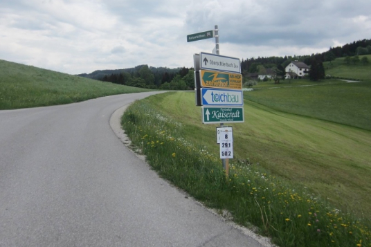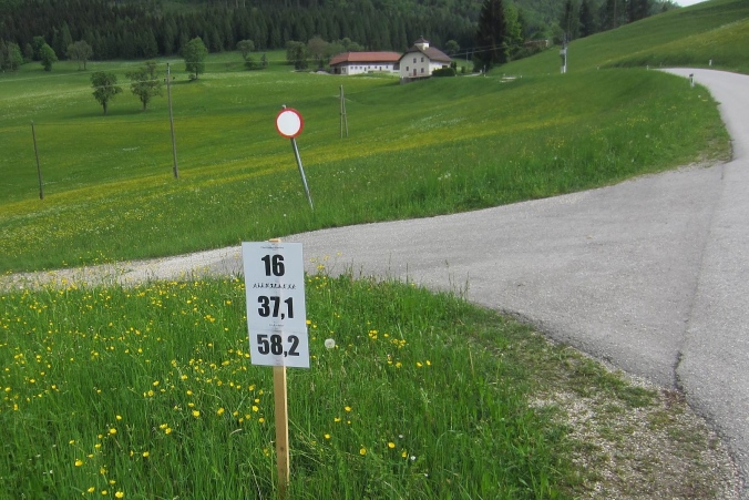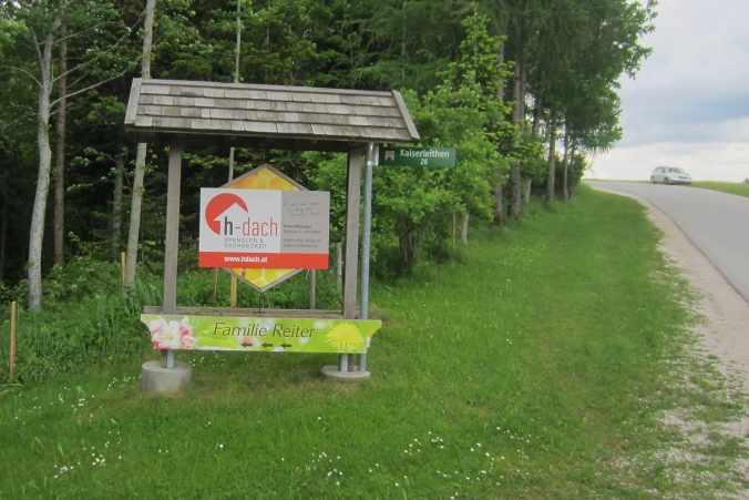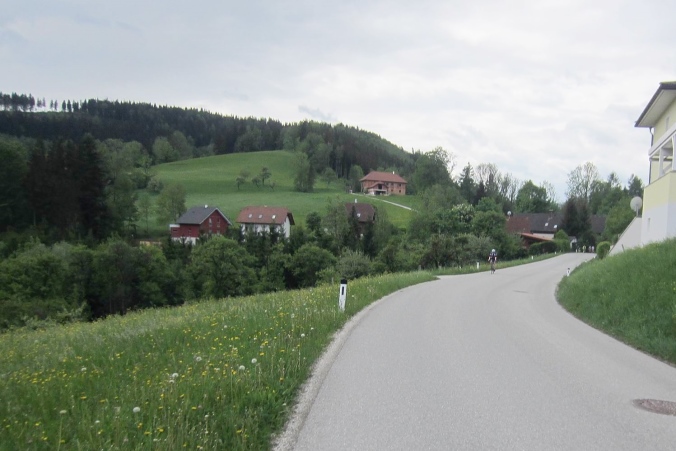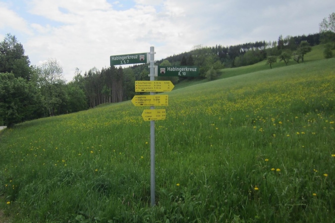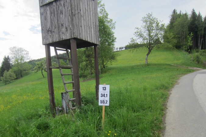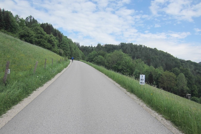 Abwärts liegt der Linzer wieder vor mir. Ich wundere mich, wie schnell er laufen kann. Eine Gruppe Radfahrer kommt mir entgegen, alle sagen freundlich „Servus“. Bald nähere ich mich dem recht steilen, gut einen Kilometer langen Anstieg hinauf zum Habingerkreuz bei Km 13,1. Der Rohbau zur Rechten steht unverändert da, dem Bauherrn dürfte schon voriges Jahr das Geld ausgegangen sein.