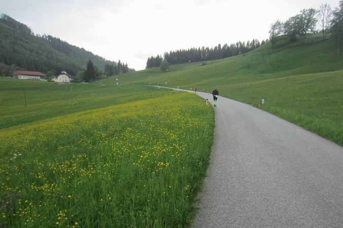 Der Regen über Nacht war ein Segen für die Natur, allerlei Wiesenblumen sprießen inmitten einer satten grünen Landschaft links und rechts der Laufstrecke. Mittlerweile werden sogenannte Ecomarathons angeboten, deren Ambiente den grünen Touch unterstreichen soll. Da könnte man als Außenstehender nur raten, das Marketing auch hier in Kirchdorf um diesen Begriff zu erweitern, denn herrlicher kann die Natur kaum sein als im Mai hier im Alpenvorland.