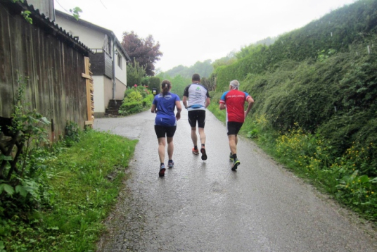 Noch vor der ersten Labe schließe ich bei Km 5 ich auf drei Läufer auf. Zwei sind für den Halbmarathon registriert, erkennbar an der rot unterlegten Startnummer, der Kollege mit dem Aufdruck „One step ahead“ ist wie ich auf 42,195km ausgerichtet.