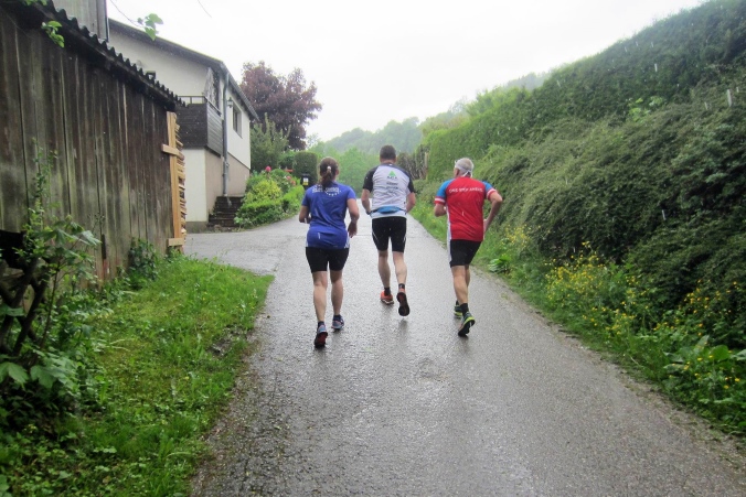 Nun geht es bei Höfern vorbei den Käfergraben hinauf nach Oberschlierbach. Die drei bei der Labestelle überrundeten Läufer haben zu mir wiederaufgeschlossen. Wegen des steilen Gefälles ist Gehen hier angebracht. Wie oft habe ich schon Läufer auf solchen Abschnitten im Gehen überholt und diese so ungewollt frustriert.