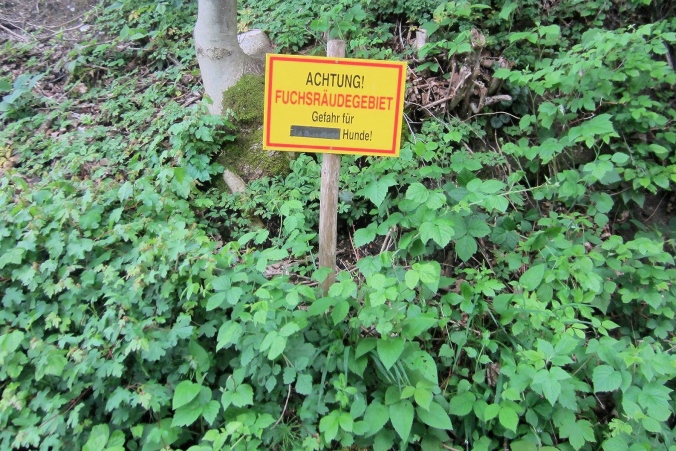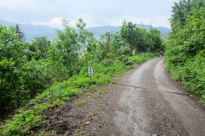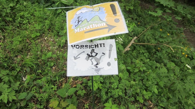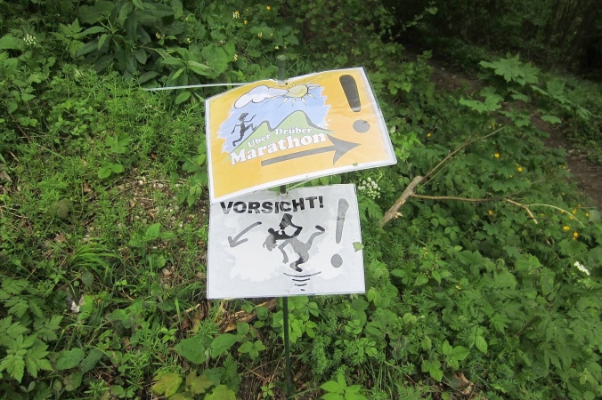 Die nun folgende kurze Abwärtsstrecke ist allerdings so rutschig, dass man achten muss, mit Laufschuhen ohne Trailprofil nicht zu stürzen. Die Organisation hat einen Anschlag befestigt, der zur Vorsicht aufruft.
