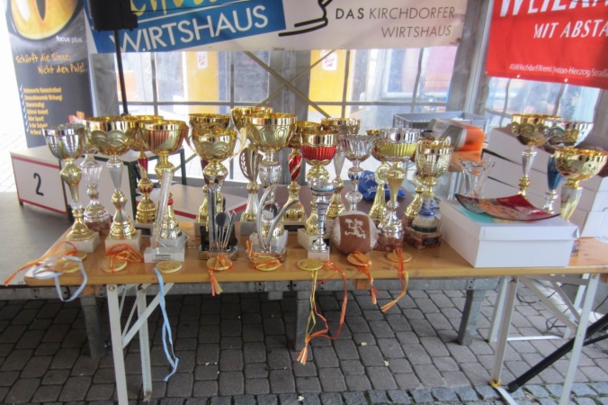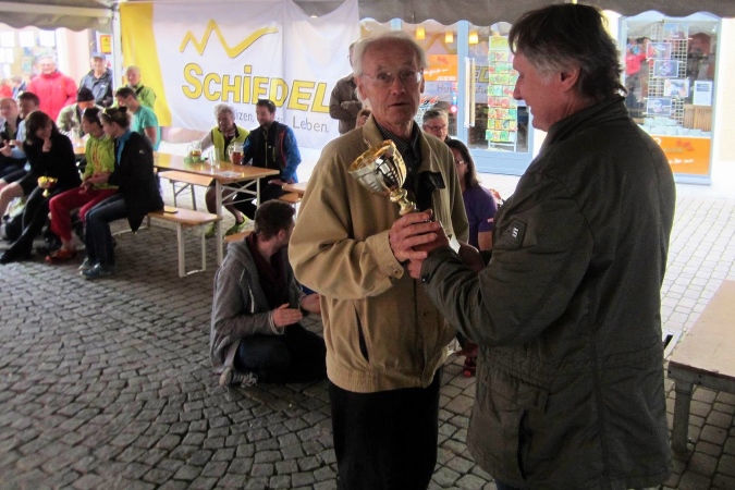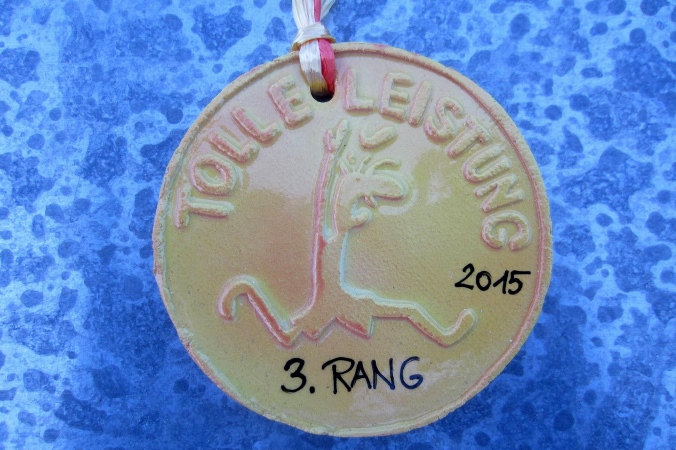 So gehe ich zu meinem Auto und trinke mein mitgebrachtes Mineralwasser. Man kann sich im nahen Hallenbad duschen. Die Siegerehrung ist für 17 Uhr vorgesehen. Wegen des dritten Platzes warte ich zu, viele, die von weiter her gekommen sind, sind schon abgereist. Die Erst- und Zweitplatzierten der in 10er-Schritten eingeteilten Altersgruppe bekommen Pokale, die Drittplatzierten eine weitere gebrannte Medaille.