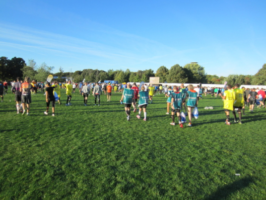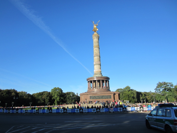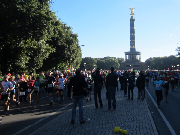 Es geht los. Letztes Jahr war mir so kalt, dass ich einen Pulli vom Boden aufhob und ihn bis Kilometer 5 anhatte. Viele der weggeworfenen Sachen sind noch tragbar. Beim New York City Marathon werden abgelegte Sportkleidungsstücke für soziale Zwecke gesammelt, bei uns landen sie häufig in der Altkleiderverwertung, die daraus Flickenteppiche u.a. erzeugt. Die Canon IXUS im Anschlag, einen zweiten vollgeladenen Akku in der kleinen Bauchtasche, so laufe ich anfangs wie alle etwas zu schnell die Straße des 17. Juni entlang nach Westen in Richtung Siegessäule, die man ja kilometerweit erkennen kann. Ich habe nicht den Eindruck, dass mich die Läufer – erst recht nicht die ausländischen aus 191 Nationen, wie der Platzversprecher verkündet – aufgrund des orangen Shirts als M4Y-„Reporter“ erkennen. Es kann ja auch sein, dass mir jemand so ein Leibchen geschenkt hat und ich es einfach so trage.