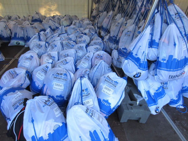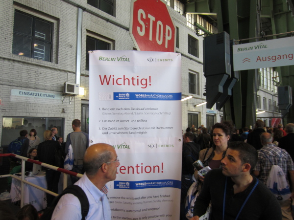 Voriges Jahr bin ich erst um 16 Uhr angereist. Das erwies sich als Fehler, denn ich stand am Ende einer vielleicht 200 m langen Schlange und wartete stundenlang. Heuer bin ich schon um 12 Uhr vor dem Gebäude, doch auch um diese Tageszeit drängen sich schon Massen in die Messehallen. Nach knapp einer Stunde habe ich es geschafft. Beim Einlass bekomme ich einen Kleiderbeutel mit einigen Werbematerialien ausgehändigt, nicht aber die Startnummer. Es dauert wieder 20 Minuten, bis ich drankomme. Die ältere Dame fragt mich, ob sie meinen bei der Anmeldung angeführten Champion-Chip technisch auf seine Funktionsweise überprüfen soll. Ich sage zu ihr: „Den habe ich aber nicht bei mir.“ Worauf sie sorgenvoll nachfragt: „Haben sie ihn denn in Wien…?“ „Nee, am Laufschuh im Hotel in Berlin…“ Eine nette Unterhaltung, die der Ami hinter mir nicht versteht.