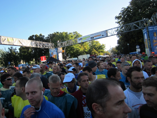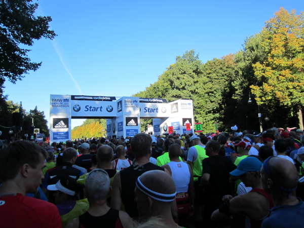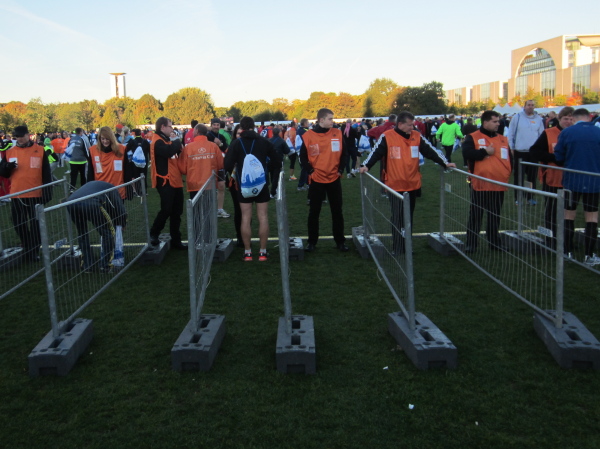 Die Entfernung von der Abgabestelle bis zum Block G, wo ich aufgrund einer angeführten Finisherzeit um 4 Stunden zugeteilt bin, ist ca. 1 km weit entfernt. Die Blöcke haben unterschiedliche Startzeiten, um 8.45 Uhr geht es für mich los. Vorher aber knipse ich noch das Geschehen, wie auch schon davor während der Anreise mit der S-Bahn und am Platz der Republik vor dem Reichstagsgebäude. Meine Stimmungsfotos sind reine Schnappschüsse, die manchmal mehr Aussagekraft haben als ein um 20 Euro kaufbares Profibild von einem Fotografen vom Motorrad aus aufgenommen, von einem Klappsessel neben der Laufstrecke aus oder gar vom luftigen Kran aus der Höhe.