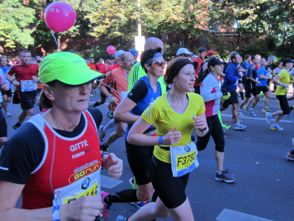Man sieht und spürt die Hektik, viele Läufer sind auch sichtlich nervös bzw. angespannt. Ein Marathontourist wie ich hat keinen Stress, höchstens ein Zubringerverkehrsmittel würde plötzlich ausfallen oder mein Chip hätte sich vom Schuhband gelöst. So aber gebe ich meinen Kleiderbeutel bei der betreffenden, ein bestimmtes Startnummernkontingent umfassenden Aufbewahrungsstelle ab. Eine junge Helferin antwortet schlagfertig, als ich sie frage, ob meine Nummer 22.276 nicht eine harmonische Zahl sei: „Mit der werden Sie bestimmt im nächsten Zahlenlotto gewinnen…“