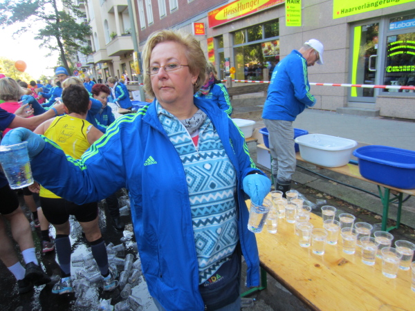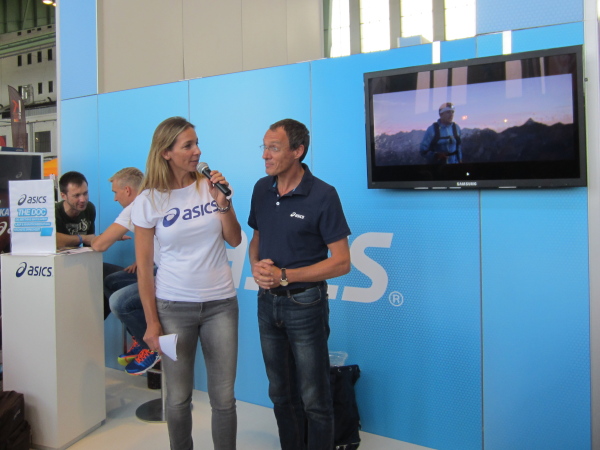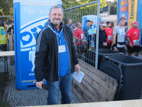 Hautaugenmerk bekommt dann jedoch nicht der Pumuckl, sondern der von einer Moderatorin herzlich begrüßte deutsche 5000 m Olympiasieger Dieter Baumann. Ich bin überrascht, wie sportlich fit der bald 50-jährige Ausnahmeleichtathlet aussieht. Er hat dann auch die passende Antwort, mehr im Scherz als ernst gemeint, parat, als er gefragt wird, warum er nach Berlin gekommen sei. „Ich bin und sehe mich als Experte, weil ich genau das gleiche erlebe wie die anderen Läufer. Nach 30 km werde auch ich müde, spüre meine Beine. Ich tue mir genauso schwer beim letzten Viertel eines Marathons wie die meisten anderen hier.“ Nach seiner aktiven Karriere ist Baumann 2007 in Frankfurt den Marathon in 2:30 gelaufen. Er weiß, wovon er spricht.