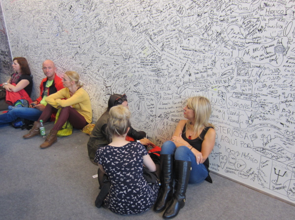 Das Vielvölkergemisch, genau genommen müsste man von Nationen sprechen, kennzeichnet die Marathonmesse in Berlin. Hinter den Deutschen dürften auch heuer wieder die Dänen bei den Teilnehmerzahlen an der zweiten Position sein. Ich habe mir voriges Jahr ein Marathonshirt für mich und eine Jacke für die Tochter gekauft, heuer ist die Kollektion noch größer und auch schöner. Neu ist, dass einem am Ausgang zurück in den weitläufigen Bereich der Verkaufsmesse ein blaues Band um das Handgelenk gelegt wird, das als Erkennungszeichen am Marathontag dient und den Zugang zum Startbereich ermöglicht.