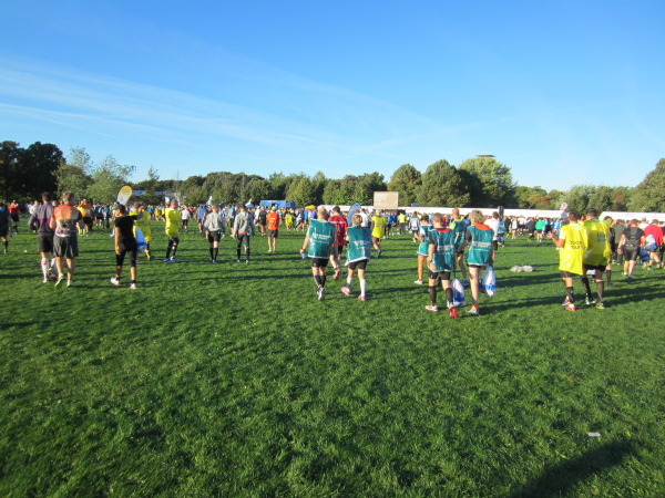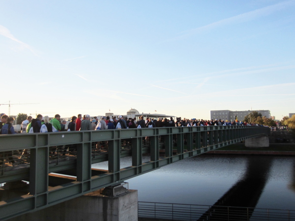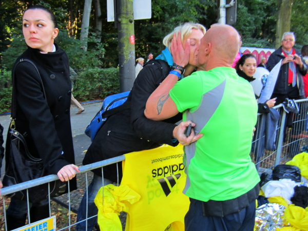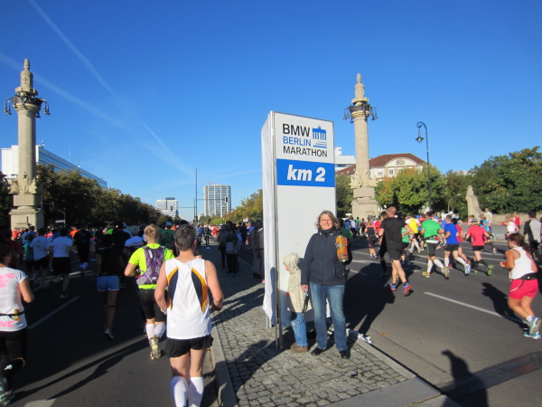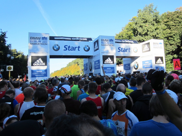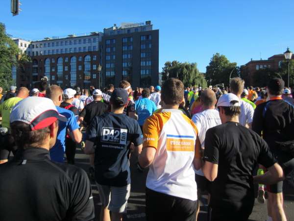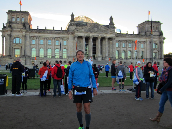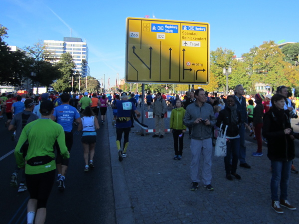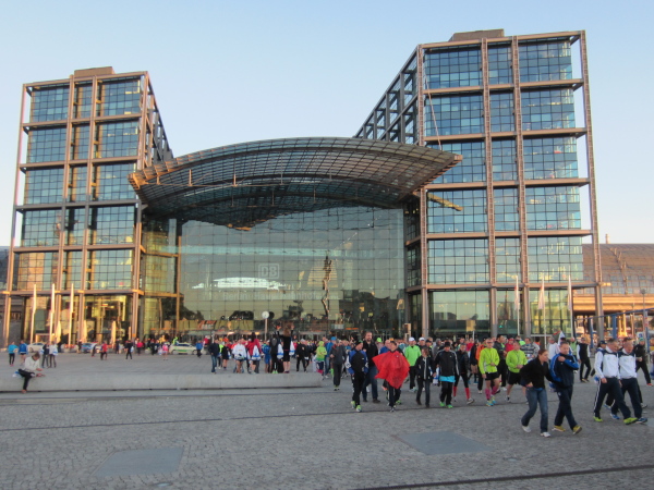 Auch das Frühstück ist bescheiden, doch ich habe mir am Vortag noch einiges bei Ullrich, meinem Hausladen am Zoo, besorgt. So frühstücke ich nach dem kargen Hotelfrühstück nochmals auf der Bettkante. Nach einem Wettercheck gehe ich ohne Eile um 7.30 Uhr aus der Unterkunft und fahre mit der zur S-Bahn vom Bahnhof Zoo zum Hauptbahnhof. Im Zug sind wenige Läufer anzutreffen, doch am Hauptbahnhof strömen plötzlich Hunderte von allen Seiten zum Ausgang in Richtung Reichstag, genau genommen über die Spreebrücke ins Grünareal um den Platz der Republik zum Start- und Zielbereich. Es hat kaum mehr als 8 Grad am Morgen, doch es würde trockenes, sonniges Herbstwetter zu erwarten sein. Bei guten Wetterbedingungen könnte ein neuer Weltrekord aufgestellt werden, spekuliert die Sportpresse. Dafür in Frage kommen mehrere Kenianer, am ehesten der Sieger des London Marathon 2012 und Olympiadritte Wilson Kipsang.