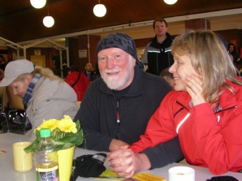 Inge reicht mir meine Jacke und freut sich mit mir am erfolgreichen Finish. Nachdem ich mich geduscht habe, treffen wir uns alle in der Pausenhalle. Bernd hat 2:05:38 für die Halbmarathonstrecke benötigt und damit seine Altersklasse M70 gewonnen. Peter konnte mit 3:39:29 eine neue persönliche Bestzeit erzielen und ist damit natürlich auch sehr zufrieden.
