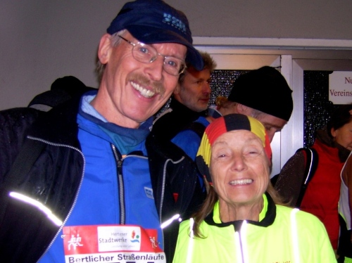 Inzwischen hat ein kalter Regen eingesetzt und das Starterfeld des Marathons hat sich fast vollständig unter das Stadionvordach geflüchtet. Hier treffe ich auch Sigrid Eichner vom 100 Marathonclub. Sie ist mit 11 anderen Vereinsmitgliedern direkt aus Arolsen herübergekommen um das Wochenende wieder zum Doppelstart zu nutzen. Nicht zufällig ist sie weltweit die Marathonläuferin mit den meisten absolvierten Läufen. Vor kurzem wurde sie von der DUV zur Seniorensportlerin des Jahres 2008 gewählt. Auch heute wird sie wieder locker finishen und ihre Altersklasse gewinnen.