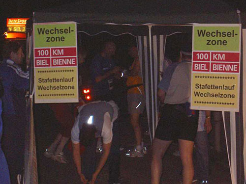 Immer noch war erstaunlich viel Leben auf der Strecke, verursacht unter anderem auch durch die Staffelläufer. Die waren um 23 Uhr gestartet und die Ersten hatten uns bereits irgendwo bei Kilometer 25 überholt. Die etwas Langsameren schlossen auch jetzt immer noch von hinten auf und überholten. Der erste Stabwechsel war in Oberramsern bei Kilometer 38,5, so dass jetzt wieder frische Läufer auf der Strecke waren. Insgesamt vier Läufer bilden eine Staffel, bei den gemischten Staffeln muss mindestens eine Läuferin dabei sein. Die 100 Kilometer teilten sich in vier Etappen auf: 38, 17, 22 und 23 Kilometer. Ich finde diese Möglichkeit sehr interessant. Da können sich Vier zusammentun, die sich die Strecke alleine nicht zutrauen und haben doch das Erlebnis von Biel!