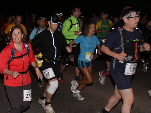 Jackie freut sich auf den Ho-Chi-Minh-Pfad: „ 27 Jahre nach meinem letzten Lauf entlang des Emmendammes biege ich also in diesen abenteuerlichen Stein- und Wurzelweg ein; der Magen hält! Nun bin ich allein, allein mit mir und allein auf diesem sagenumworbenen Weg! Welch eine Wonne, welch ein Glück! Laufen pur, Laufen im Dunkeln in der Natur! Ich schnappe Läufer um Läufer, ab und zu prescht ein Staffel-Läufer vorbei. Nichts mehr kann mich aufhalten – ich weiß, dass ich es schaffe! Mein Ziel vor Augen laufe ich weiter! Irgendwann überhole ich eine bucklige Gestalt - wow! - ein Läufer ohne Stirnlampe! ‚Wilde Sieche‘ gibts!“
