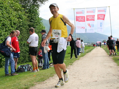 Jürgen Zettler, der seine Zeit (9:59) geträumt hat, schafft seine ersten 100 km in 10:48 Stunden. Er hat bei seinem Traum wohl was verpasst. Neben der Zeit stand das 90km-Schild. Kommt also hin, Jürgen.
