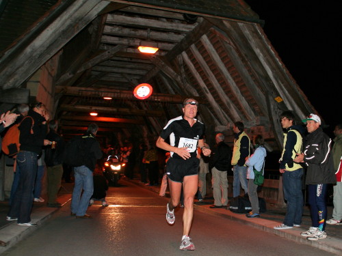 Derweil laufen in Aarberg ( km 20) die letzten Vorbereitungen. Getränke, Obst und Riegel werden portioniert und auf den Tischen ausgebreitet. Auf dem Stadtplatz mit der Kirche und dem Amthaus versammeln sich immer mehr Menschen, um die Läufer in Empfang zu nehmen. Die Holzbrücke von Aarberg hat sich zu etwas wie einem Wahrzeichen des Bieler 100er entwickelt. Es ist schon ein tolles Bild, wenn die Läufer über die Brücke durch das Zuschauerspalier laufen. Und man sieht es ihnen an, sie genießen den Applaus.