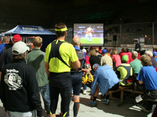 Es geht im Zickzack durch eine Großbaustelle und dann auf einem Feldweg zur Eissporthalle. Hier stehen die ersten Zuschauer Spalier und empfangen die Helden. Die Zuschauerdichte nimmt zu, es wird immer lauter. Alle Läuferinnen und Läufer werden namentlich genannt und die Zahl ihrer Teilnahmen verkündet. Den meisten ist die Anstrengung nicht anzusehen. Die Freude und der Triumph überdecken die Strapazen und die Müdigkeit. Man sieht es jedem und jeder an: Heute ist ein besonderer Tag.