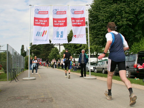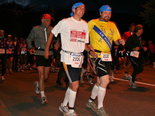 Es dämmert, die Läufer kommen über Lüterkofen und Ichertswil zum kleinen Verpflegungsposten in Bibern (km 77). Stressfrei wird die Nahrungsaufnahme erledigt. Man hat Zeit. 23 Kilometer weiter, in Biel, läuft gerade Helmut Dehaut ins Ziel (7:32 Stunden) und wird von Matthias Dippacher aus Heroldsbach erwartet, der rund 4 Minuten schneller ist. Seit sage und schreibe 38:48 Minuten ist allerdings schon Walter Jenni im Ziel, er gewinnt in 6:49:43,9 den Jubiläums-100er von Biel. Es ist noch nicht 6.00 Uhr, da hat Sonja Knöpfli als erste Frau die 100 Kilometer geschafft (7:54:51).