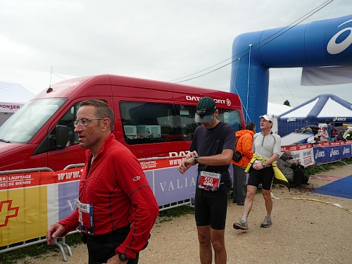 Gegen 17.00 Uhr fahre ich am expo02-Gelände mit meiner Karre auf den großen Parkplatz. Perfekt, nur gerade mal zehn Meter zum Eingang des Festzeltes und 20 zum Zieleinlauf. Was mir weniger Freude bereitet, ist die Wetterprognose, denn von Westen und über dem Jura hängt bereits eine dicke Wolkendecke. Mit 25 Grad ist es auch außerordentlich schwül. Der Wetterfrosch prognostiziert für die kommende Nacht große Niederschläge. Na denn Prost! Wer seine Dackelgarage (Zelt) aufbauen will, findet genügend Platz auf der anderen Seite des Zeltes und sollte vielleicht schon mal Schwimmwesten bereitlegen.