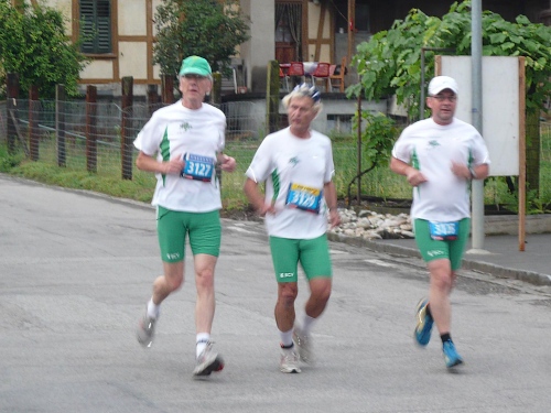 20 Minuten später wird der Streckenverlauf schon gefälliger. Wir blicken hinunter in das Aaretal. Gegenüber ist der Jura noch in dicker Wolkendecke eingehüllt. In Arch (so der Name der Ortschaft) bin ich im Arsch. Bei diesem Gedanken muss ich schmunzeln, denn die letzten 20 Kilometer sind jetzt flach. Wer es bisher geschafft hat, der wird ins Ziel kommen. Diese Weisheit teile ich einem bayerischen Laufkollegen mit. „Dein Wort in Gottes Ohr“, höre ich noch. An einer Tankstelle für Motorfahrzeuge am Ortseingang Arch zeigt es 16 Grad an.