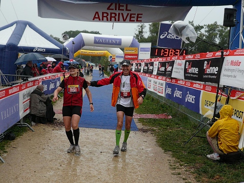 Ich verzögere und warte, bis der Warendorfer Frank Böning aufgeschlossen hat. Wir sprechen uns kurz ab, denn ein gemeinsamer Zieleinlauf ist doch schöner. Die Zuschauer nehmen zu. Und dann nach einigen Kurven sehen wir den blauen Teppich auf dem expo02-Gelände und das Zielschild vor uns. Geschafft. Das war heute auf der letzten Rille.