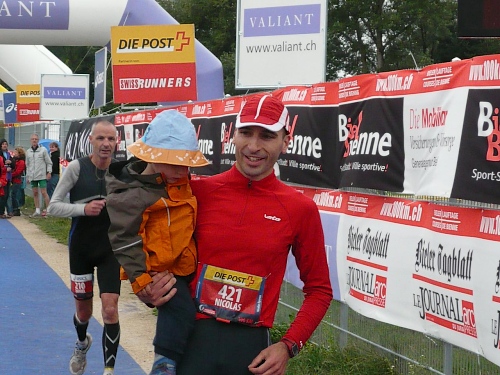 Die ersten Kilometer verlaufen auf einer Start- und Stadtrunde durch die Innenstadt. Wir laufen auf der Zentralstrasse über den Zentralplatz nach rechts auf den oberen Quai entlang des Flüsschens Schüss. Von hinten fällt mir eine markante Figur auf. Den kenn ich doch. Ja, ein Blick von der Seite genügt, um zu sehen, es ist Anton Luber aus Nürnberg. Er versucht sich heute zum ersten Mal auf dieser Distanz. In Fürth vor 14 Tagen war er knapp vor mir im Ziel. Ich beschreibe dem Läufer mit Handicap noch kurz den Weg auf dem nächsten Kilometern und gebe den Rat, die ärgsten Steigungen im Wanderschritt hinter sich zu bringen.