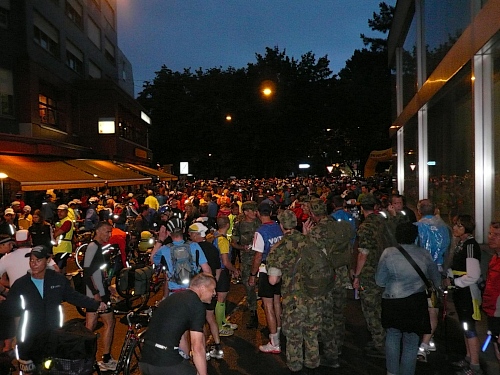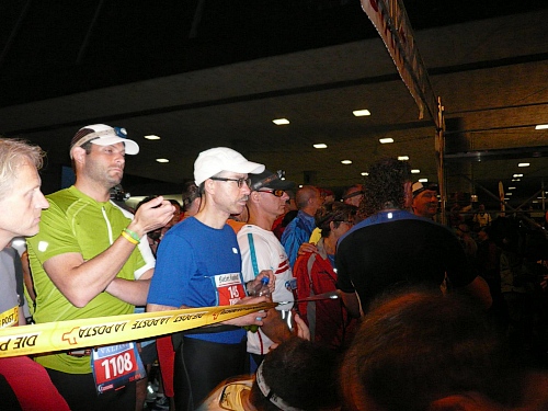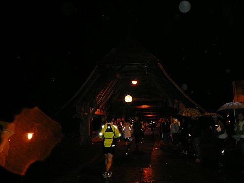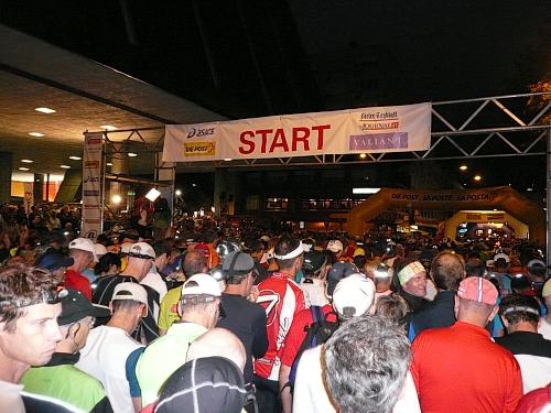 Als ich mich um 21.30 Uhr auf den Weg zum Kongresshaus aufmache, ist zumindest der Wasserhahn von oben zugedreht. Rund 20 Grad hat es jetzt. Da ich Petrus heute Nacht nicht traue, nehme ich die Funktionsjacke mit. Stirnlampe ist auch Pflicht. Verpflegung und Getränke brauchen wir nicht unbedingt mitführen, denn zahlreiche Verpflegungsstellen sind auf der großen Runde vorhanden.